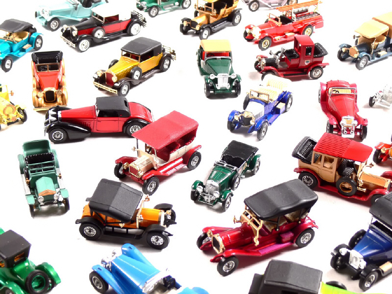 miniatures reproduisant notamment les modèles : MERCEDES, MERCER, PACKARD, HISPANO SUIZA, RENAULT, STUTZ, JAGUAR, SPYKER, BENTLEY, SIMPLEX, OPEL, RILEY, DUESENBERG, PACKARD LANDAULET, CROSSLEY & FORD - quelques détails de peinture ajoutés & parties repeintes - petits manques & éléments cassés