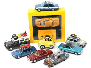 échelle 1/24ème à 1/25ème - miniatures reproduisant les modèles : ROVER, ROLLSROYCE, PEUGEOT, CITROEN, ALFA ROMEO, MERCEDES, VOLKSWAGEN, FIAT, RENAULT, SIMCA, FERRARI & JAGUAR - on y retrouve les marques : BBURAGO, POLISTIL, MEBETOYS & POLITOYS - un véhicule sous coffret accompagné d'un flacon d'eau de toilette 'FERRARI' non utilisé - possibilité de petits manques