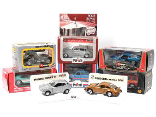 grandes échelles - miniatures reproduisant les modèles : ALPINE RENAULT, RANGE ROVER, RENAULT, ROLLS ROYCE, MERCEDES, CITROEN, CHEVROLET, BUGATTI, PORSCHE & HONDA - on y retrouve les marques : BBURAGO, TONKA-POLISTIL & POLISTIL