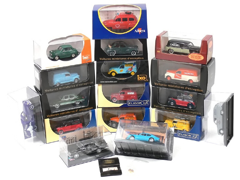 comprend : SIMCA PRESIDENCE, AUSTIN A35, PEUGEOT 203 découvrable, PANHARD DYNA X tôlée 'LE ROUGE & LE NOIR', PANHARD DYNA X taxi, RENAULT COLORALE 4x4 de pompiers, PANHARD DYNA X tôlée 'LA GENTIANE', PANHARD DYNA X tôlée, PANHARD DYNA X tôlée 'BELLECOUR', PEUGEOT 403 tôlée 'CHANEL', PEUGEOT 203 C8 'LAIT MONTBLANC', PEUGEOT 203 tôlée 'ORANGINA', PANHARD DYNA X tôlée 'HUILES LABO', CITROEN 2CV fourgonnette 'AFFICHAGE GIRAUDY', SIMCA CG 1300, PANHARD DYNA Z12 GRAND STANDING & SIMCA ARONDE MESSAGERE 'SERVICE SIMCA' - on y retrouve notamment les marques : ELIGOR, NOREV, ELIGOR, IXO, ELYSEE, ALTAYA & VEREM - plusieurs modèles avec figurine & boîtages spécifiques de la COMPAGNIE EUROPEENNE DES COLLECTIONNEURS