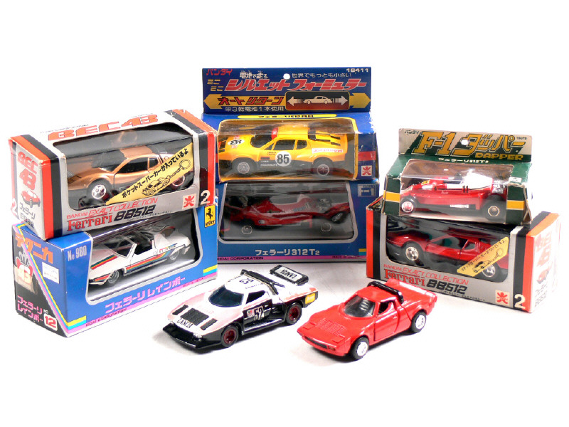 miniatures reproduisant les modèles FERRARI & LANCIA (en état 'C') - on y retrouve les marques : YONEZAWA TOYS (un exemplaire avec retouches), BANDAI & EIDAI GRIP - 2 véhicules sans boîte