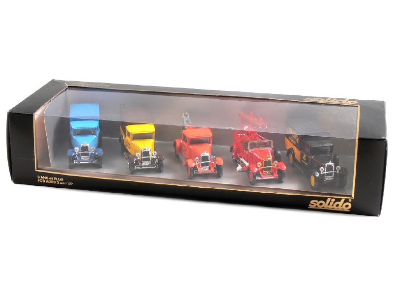 série AGE D'OR - contient : 2 fourgons 'AU BON MARCHE' & 'SAMARITAINE', un minibus 'PALACE HOTEL', une dépanneuse 'GARAGE DU PONT' & un camion de pompiers 'VILLE D'ARGELES-GAZOST'