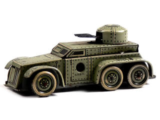 longueur 10 cm - avec moteur à clef & système de pierre à briquet pour les canons (fonctionnent) - petites traces d'oxydation - quelques petits enfoncements