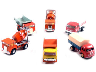 miniatures reproduisant les modèles FAUN (manque un autocollant sur un camion, un axe & 2 roues non d'origine sur un autre, jantes légèrement fondues sur un 3ème) & MERCEDES (en état 'D' avec ridelles manquantes & 2 éléments non d'origine)