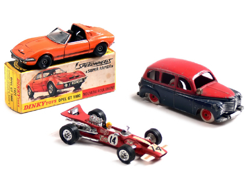états de 'B' à 'R' - miniatures reproduisant les modèles : OPEL (transformé, en boîte tachée état 'b' ), RENAULT (jantes légèrement fondues) & SURTEES - on y retrouve les marques DINKY TOYS FRANCE & C.I.J