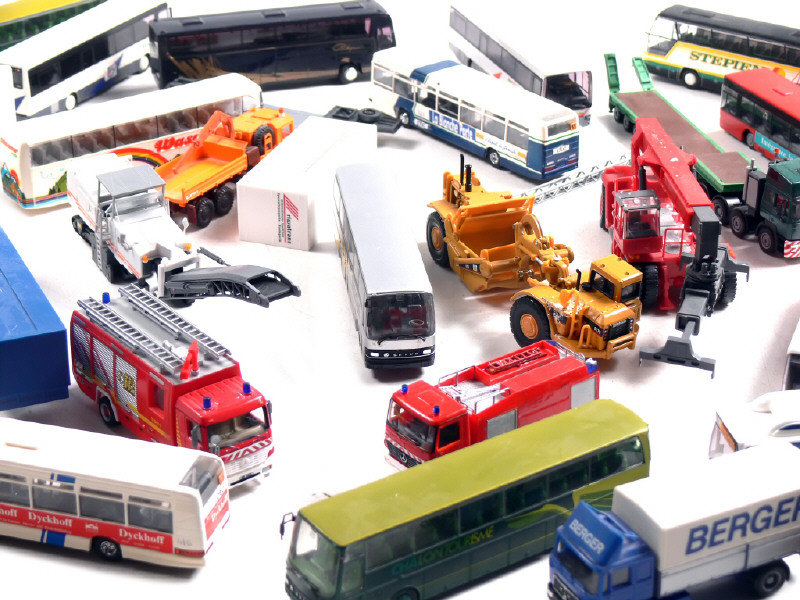 petites échelles - comprend : des autocars, des engins de travaux publics, des camions, des voitures ...... - miniatures reproduisant notamment les modèles : RENAULT, MERCEDES, KÂSSBOHRER, VOLVO, MAN & GROVE - on y retrouve notamment les marques : PRALINE, RIETZE, BUSCH, NZG, HERPA & WIKING - quelques manques & parties cassées
