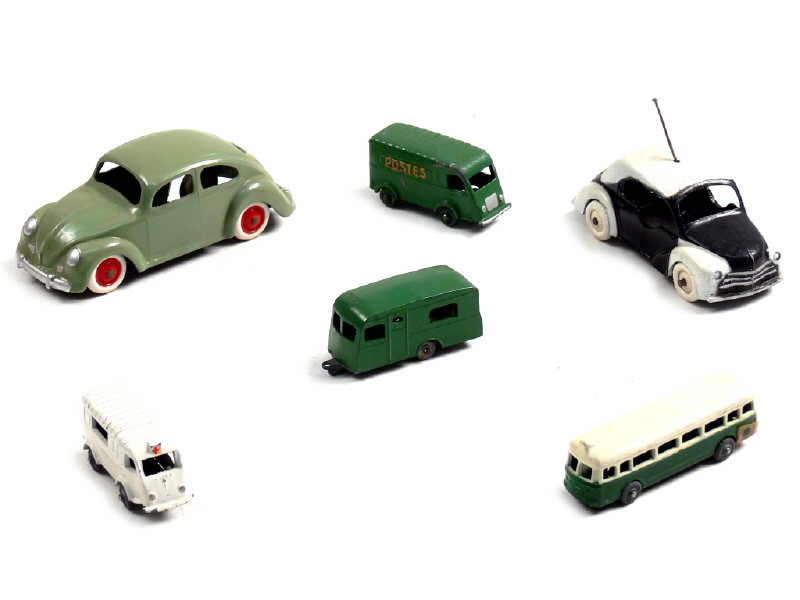 états de 'B' à 'R' - miniatures reproduisant les modèles RENAULT (pneus non d'origine, retouches, décalques manquants sur la 4CV Police, défauts de rivetage sur l'autobus) & VOLKSWAGEN - 2 exemplaires de la marque GITANE