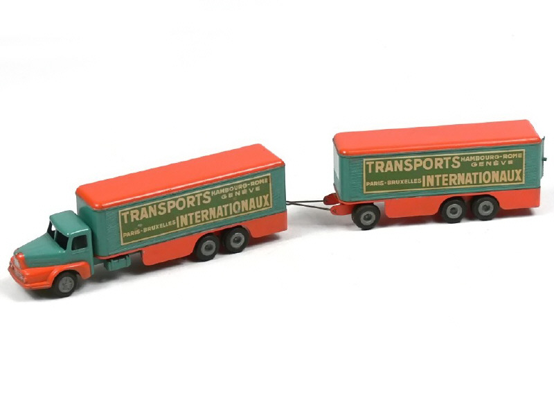 JRD (FRANCE) 127 UNIC LAUTARET 'TRANSPORTS INTERNATIONAUX' avec remorque vert canard & orange