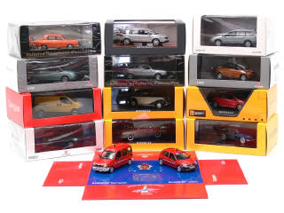 miniatures reproduisant les modèles : CITROEN, RENAULT & PEUGEOT - 2 coffrets de 2 véhicules dont un regroupant châssis, carrosserie & aménagements intérieurs & un autre de la 'BRIGADE DE SAPEURS-POMPIERS DE PARIS' - une boîte en état 'c'