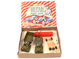 contient : un camion de dépannage (quelques traces de colle sur la cabine & crochet de chèvre manquant), un camion-benne basculante, une télécommande à câble & 2 essieux avec roues de rechange - avec cale de boîte - manque la voiture d'état-major - commande à piles non testée - longueur de chaque camion : 18.5 cm & 20.5 cm