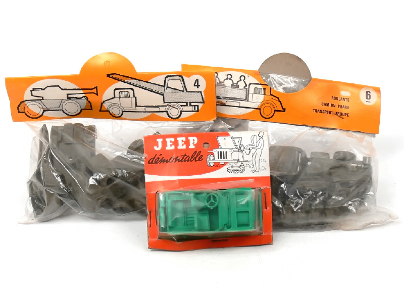 contient : MERCEDES dépanneuse, MERCEDES canon antiaérien & un EBR - on y joint un sachet n°6 de la marque (jamais ouvert ) contenant 2 MERCEDES radar, transport de troupes & une cuisine roulante & une 'JEEP DEMONTABLE' de marque indéterminée (sous blister jamais ouvert)