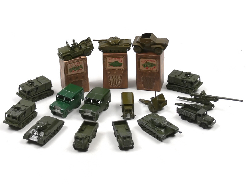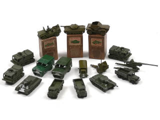 états de 'B' à 'E' - échelle 'HO' - miniatures reproduisant notamment les modèles : BEDFORD, COMBAT CAR, T34 & PATTON - traces de métal fatigue sur 2 véhicules avec petits manques