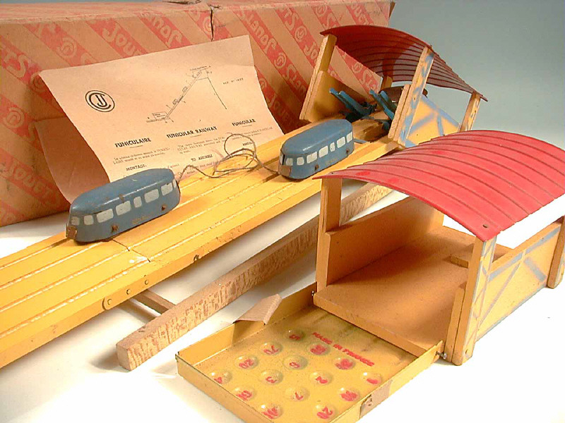2ème version de 1956 - dimensions 90 x 40 cm - tôle & bois - mouvement à billes faisant monter & descendre simultanément les deux cabines - manque les billes & le couvercle de boîte - avec sa notice
