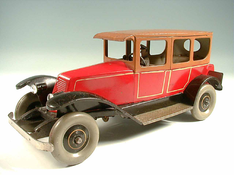 longueur 39 cm - moteur à clef avec marche avant & arrière (ressort probablement détaché) - avec direction, phares électriques & chauffeur - restaurations