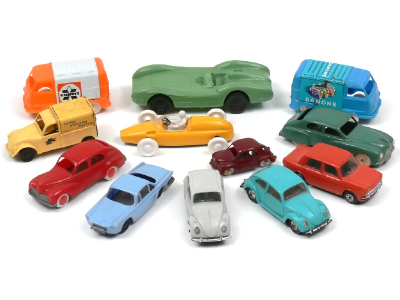 états de 'B' à 'D' - miniatures reproduisant les modèles : PEUGEOT, RENAULT, CITROEN, SIMCA, VOLKSWAGEN, MERCEDES, COOPER & HOTCHKISS - on y retrouve les marques : ECF, BS, CLE, DV, SESAME, NOREV, MINIALUXE & BONUX - quelques petits manques & certains axes de roues oxydés