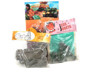 contient : MERCEDES bâché, MERCEDES radar & une semi-remorque surbaissée - réalisation en plastique à monter sous sachet jamais ouvert - on y joint un blister 'COMBAT PLATOON' (jamais ouvert & de marque indéterminée) contenant 2 JEEP, une ambulance, un canon & un sachet de 6 camions militaires de petites échelles (jamais ouvert)