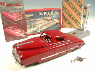 longueur 26 cm - moteur à clef (fonctionne) - ce modèle peut se transformer en cabriolet après déverrouillage du hard-top & mise en place du pare-brise (manque) - la direction s'effectue avec molette située dans la calandre - notice - clefs - traces d'oxydation dues aux piles sur le châssis & le dessus du capot
