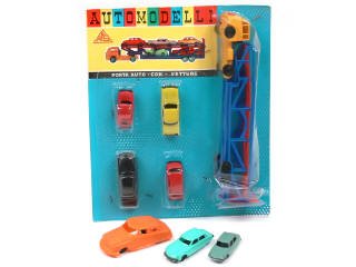 petite échelle - réalisation en plastique - contient : FIAT semi-remorque porte-autos (remorque déformée), CITROEN DS 19, FIAT 600 (pare-chocs arrière déformé), FIAT MULTIPLA & LANCIA APPIA - sous blister (déchiré) jamais ouvert - on y joint 3 CITROEN DS 19 dont une de la marque MONTAPLEX (ESPAGNE)