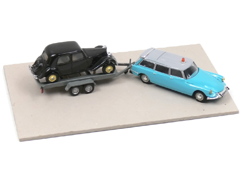 SVM (FRANCE) CITROEN ID 19 Break pick-up de dépannage avec CITROEN Traction sur remorque bleu ciel, 2 tons de gris & noir