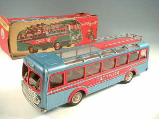 en tôle lithographiée - longueur 39 cm - moteur à friction (fonctionne) - en mouvement, les essui-glaces fonctionnent - toit ouvrant - manque valises en carton & plexi du pare-brise