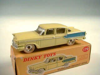 DINKY TOYS (GB) 179 STUDEBAKER PRESIDENT Sedan jaune citron & filets bleus, jantes aluminium