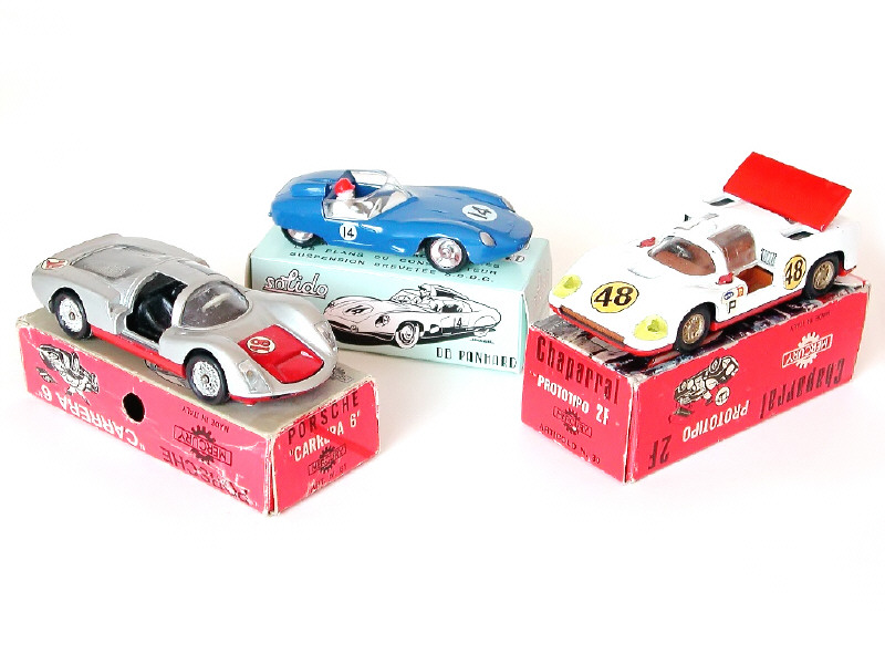 états de 'A' à 'B' - miniatures reproduisant les modèles : PORSCHE CARRERA (manque une porte & lunette arrière rayée), CHAPARRAL (manque une porte & petits manques sur les décalques) & DB PANHARD (réédition) - on y retrouve les marques : MERCURY & SOLIDO - boîtes états 'a' à 'c'