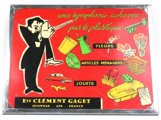 dimensions 64 x 52 cm - représente une partie de la gamme des articles fabriqués par la marque - quelques légères retouches - une petite gravure rajoutée
