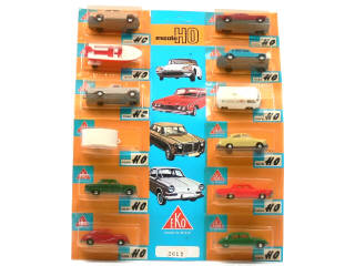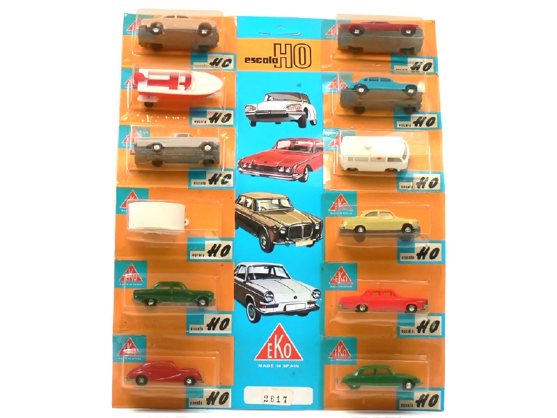 échelle 1/86ème - miniatures reproduisant les modèles : CITROEN, OPEL, BMW, CHEVROLET, DODGE, STUDEBAKER, FORD, MERCEDES & ROVER - comprend également un bateau sur remorque & une caravane - chaque emballage se détache permettant la vente des véhicules à l'unité - blister jamais ouvert