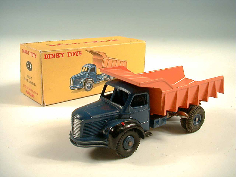 DINKY TOYS (FRANCE) 34A BERLIET Benne carrière MARREL (version avec jantes convexes) bleu foncé & orange