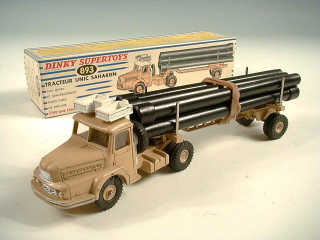 DINKY TOYS (FRANCE) 893 UNIC Saharien transport de pipe-lines (version avec jantes concaves & remorque ajourée) sable & blanc