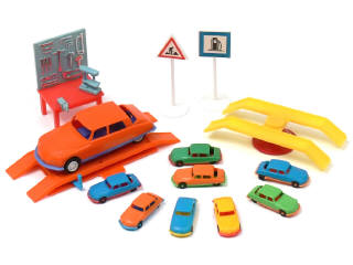 réalisation en plastique - comprend 8 DS à l'échelle 'N', un établi avec outillage, 2 ponts-élévateur & 2 panneaux de signalisation