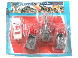 réalisation en plastique - contient : 3 camions-plateaux (avec canon antiaérien, lance-missile & projecteur) & une ambulance - sous blister jamais ouvert