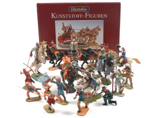 états de 'B' à 'D' - on y retrouve notamment : chevaliers, légionnaires romains, indiens & cow-boys - quelques figurines peintes & socles non d'origine - avec manques - on y joint un livre en langue allemande sur la marque