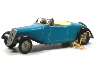 longueur 28,5 cm - moteur à clef (fonctionne) - avec direction, clef & 2 personnages en composition - version avec calandre à chevrons - quelques traces d'oxydation - 2 pneus craquelés - TRES BEL ASPECT GENERAL POUR UN MODELE DE CETTE EPOQUE !