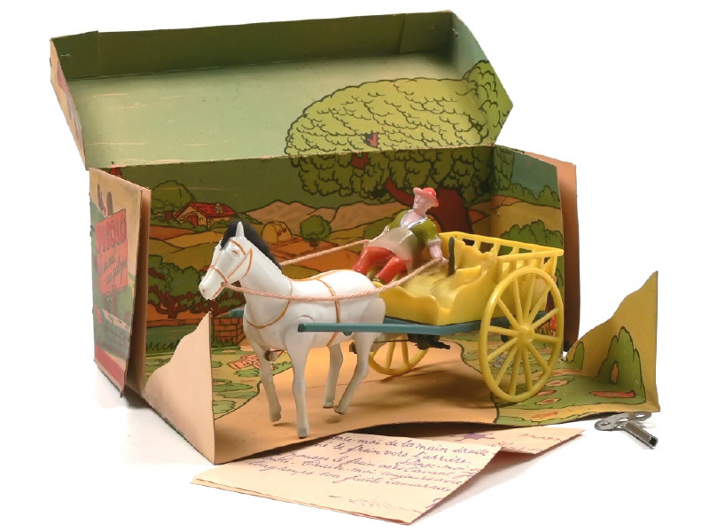 longueur 21 cm - réalisation en plastique - moteur à clef (à revoir) - en action, le cheval galope - avec clef, lettre de recommandation signée PICOLO & boîte-diorama