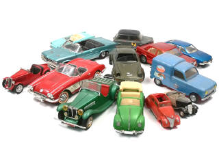 états de 'B' à 'D' - miniatures reproduisant notamment les modèles : MERCEDES, CITROEN, PORSCHE, CHEVROLET, PONTIAC, MG, RENAULT, FIAT, AUSTIN & VOLKSWAGEN - on y retrouve notamment les marques : ERTL, JOUSTRA, SANCHIS & POLISTIL - quelques manques & parties oxydées