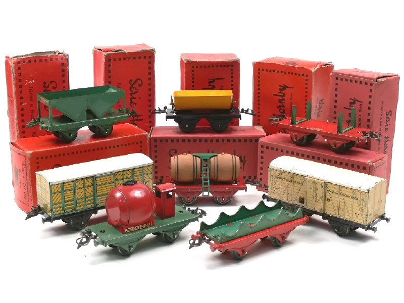 états de 'C' à 'D' - comprend : foudre-simple avec guérite, foudre-double (tonneaux en bois), plateau porte-tonneaux (manque tonneaux & chaînettes), benne-basculante, porte-bois (manque chargement), fourgon frigorifique, trémie (manque une boucle d'attelage) & fourgon à lait (un attelage incomplet) - petites traces d'oxydation - tous les modèles sont avec boîte (états de 'c' à 'e')