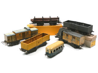états de 'B' à 'C' - comprend : wagon porte-bois (avec boîte & traces d'oxydation sur les chaînettes & les attelages), 2 wagons-tombereaux (un exemplaire avec boîte non conforme, caches-boggies manquants & attelages oxydés & l'autre avec un axe, 2 roues & un cache-boggie manquants & traces de métal fatigue sur 3 autres roues), wagon-secours (manque crochet, une partie de chaîne & cache boggies), wagon-fourgon à bagages de la FLECHE D'OR (manque une barre de fermeture de portes & tampons non d'origine) & voiture PULLMAN