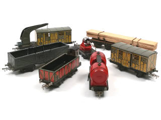 états de 'A' à 'D' - comprend : wagon-foudre double, tombereau avec vigie, tombereau à double portes ouvrantes, fourgon, plateau avec projecteur, de secours (ficelle de crochet non d'origine & traces d'oxydation sur les axes de roues) & porte-planches