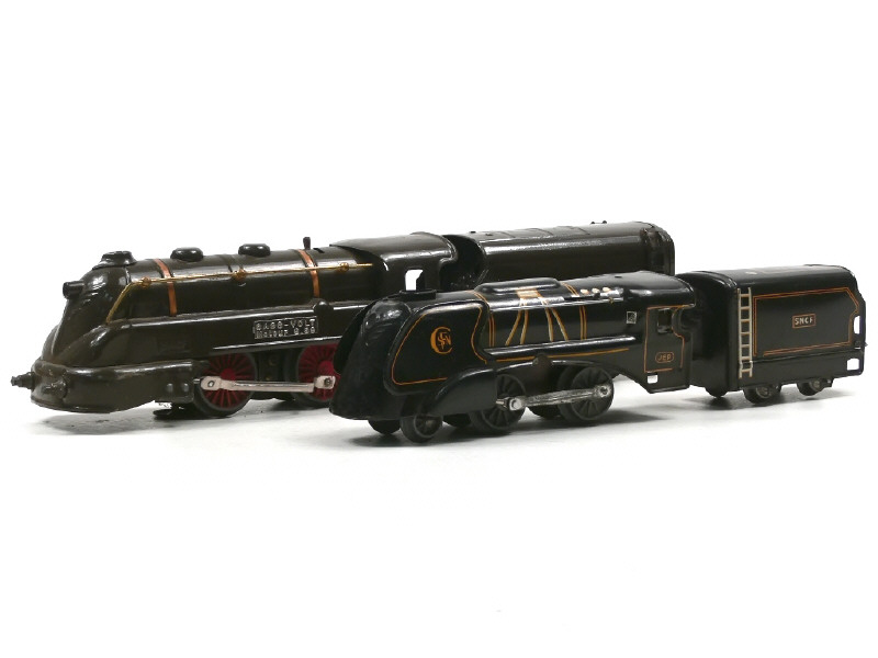 version électrique - manque bissel avant avec roues & axe - tampons incomplets - un ressort de frotteur écrasé - attelage déformé - un axe de roue de tender légèrement déformé
