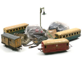 états de 'B' à 'D' - comprend : 2 voitures de voyageurs 'PULLMAN', wagon 'POSTES & TELEGRAPHES', wagon-fourgon à bestiaux, pupitre de commandes, lampadaire, support d'alimentation & 2 transformateurs (dont un de la marque JOUEF) - quelques petits manques & traces d'oxydation