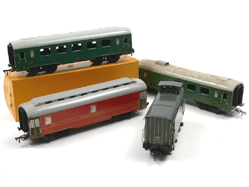 JEP (FRANCE) Ensemble de 2 voitures de voyageurs, un fourgon 'POSTES & TELEGRAPHES' & un fourgon à bagages