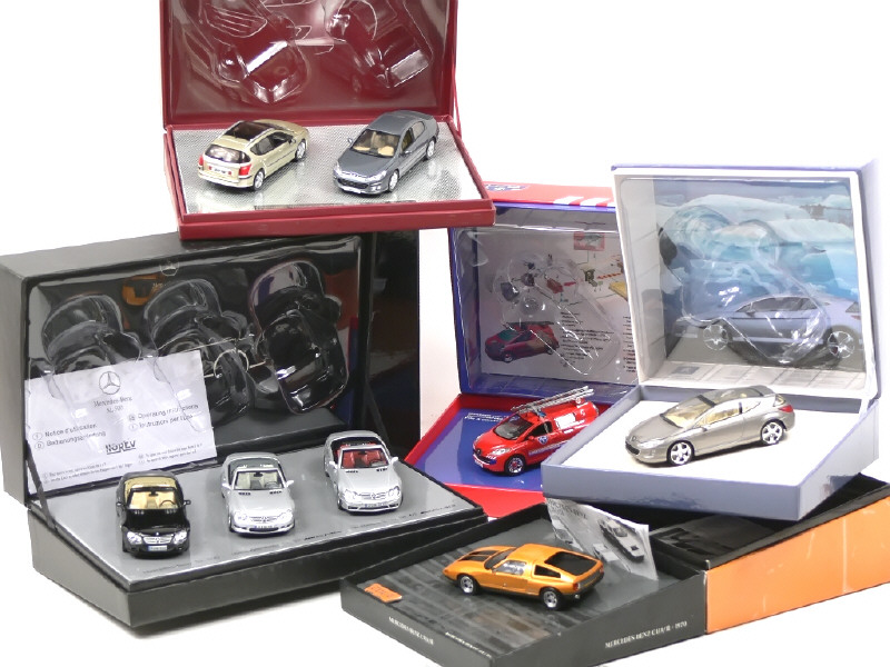 miniatures reproduisant les modèles PEUGEOT & MERCEDES - on y retrouve les marques NOREV & MINICHAMPS - 7 voitures regroupées dans 3 coffrets