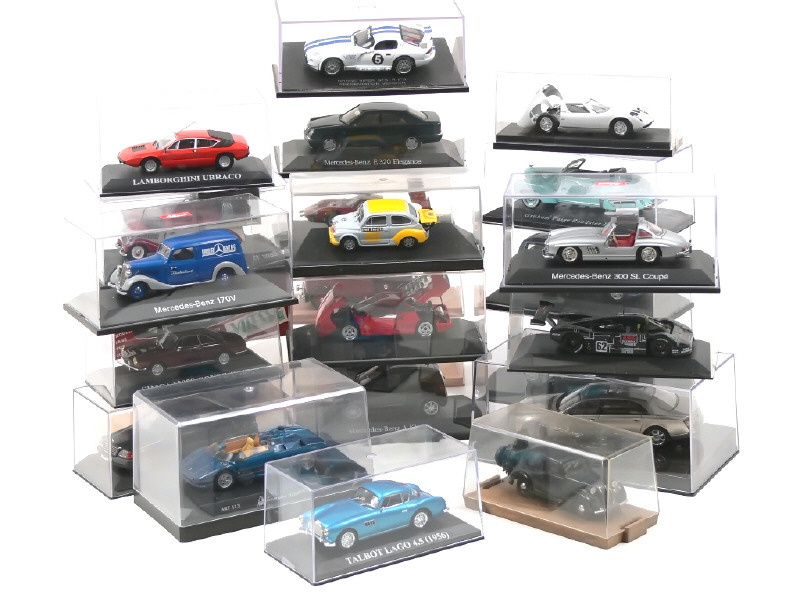 miniatures reproduisant les modèles : MERCEDES, PEUGEOT, LAMBORGHINI, TALBOT LAGO, FIAT, FERRARI, GRAHAM PAIGE, MAYBACH, SIMCA, FORD & DODGE - on y retrouve notamment les marques : SCHUCO, ELIGOR, MAX MODELS, VITESSE, BRUMM & PROGETTO K