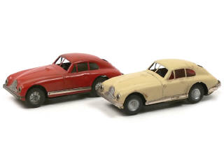 il s'agit d'un des tous premiers modèles de la firme SCALEX (premier nom de la société SCALEXTRIC) réalisé en tôle au début des années 50, équipé d'un système de rétro-friction (fonctionne) & d'une direction - carrosserie légèrement ternie & encrassée