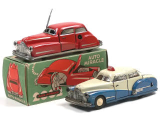 longueur 13,5 cm - moteur à clef (fonctionne) - en action, la voiture avance puis s'arrête tandis que la porte du conducteur & le capot s'ouvrent - elle redémarre en changeant de direction & les mouvements se répètent - avec notice