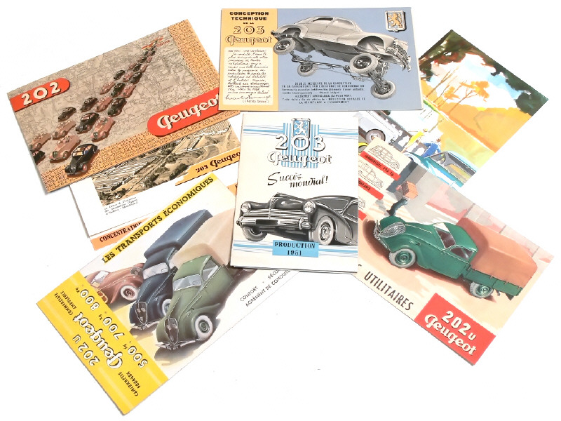 on y retrouve les modèles : 202 (3 exemplaires différents), 203 (3 exemplaires différents) & un dépliant présentant différents modèles de la marque de 1957