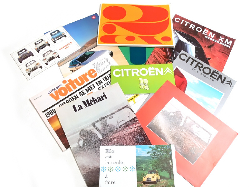 on y retrouve les modèles : 2CV, 2CV AM, 2CV6, AMI 6, MEHARI, DYANE, LNA, XM, XSARA, un journal 'CITROEN VOITURES' & 2 dépliants des gammes de 1968 & 1974