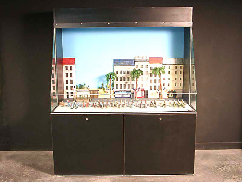 dimension : 154 x 180 x 76 cm - équipé de 2 tiroirs dans la partie basse (avec serrures), d'un éclairage dans la partie haute & de vitres en verre 'sécurit' permettant une vue en hauteur, latérale & horizontale - ce meuble à été spécialement réalisé pour les visites du public, il offre ainsi une bonne vision aux enfants à partir de 4 ans & aux handicapés - meuble entièrement démontable - vendu sans le font de la partie haute (simple planche vissée) si vous n'êtes pas acheteur du diorama