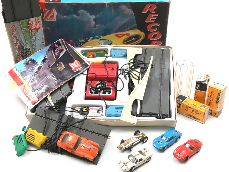 dimensions du coffret : 50 x 30 cm - état de 'B' - contient : une JAGUAR type E cabriolet, une MERCEDES 300SL, 4 accélarateurs, 2 éléments de pont, 16 rails, un transformateur, un bon de contrôle & des notices - quelques traces d'éléments fondus à l'intérieur du coffret - on y joint un coffret 'ROCKING ROAD' (état 'B.b'), une FERRARI (2 exemplaires différents), une FORD, une ALPINE de la marque & une FERRARI de la marque TRIANG SCALEXTRIC (repeinte)